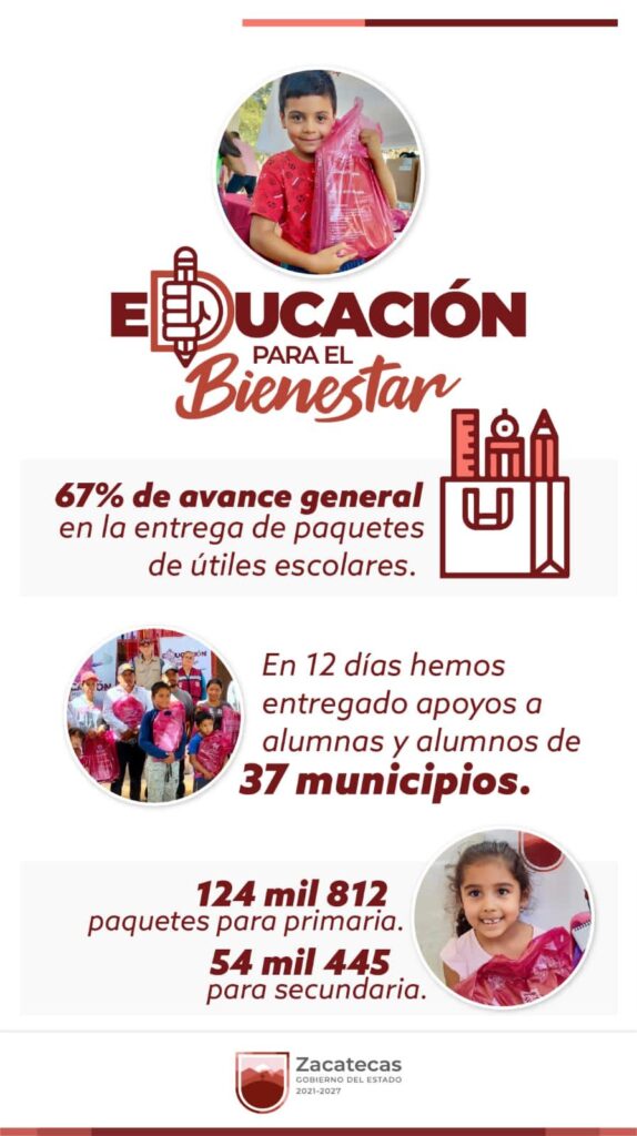 Zacatecas, Zac., 03 de agosto de 2023.- A 12 días de haber iniciado, el Programa Educación para el Bienestar, que impulsa el Gobernador David Monreal Ávila en respaldo a la educación de la niñez y juventud zacatecana, ha llevado paquetes de útiles escolares a 179 mil 257 estudiantes de primaria y secundaria de escuelas públicas, de 37 municipios, en los cuales, se ha cubierto el 90 por ciento del alumnado que cursa estos niveles.