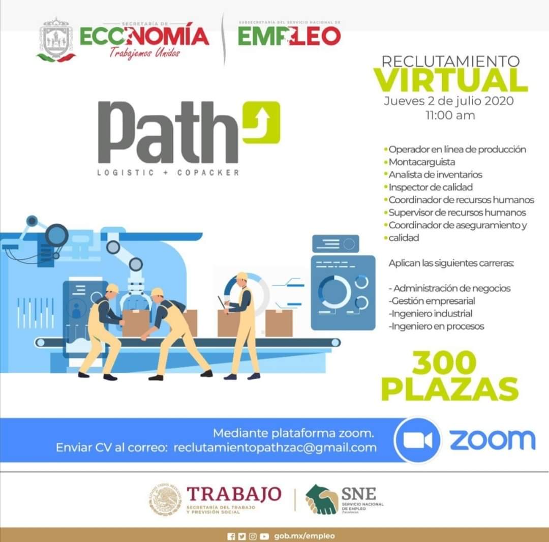 Zacatecas, Zac.- El próximo jueves 2 de julio, el Gobierno del Estado realizará la Treceava Jornada de Reclutamiento Virtual para la empresa Path Logistic Copacker, que ofertará a la población zacatecana más de 300 vacantes para operarios, técnicos y profesionistas.