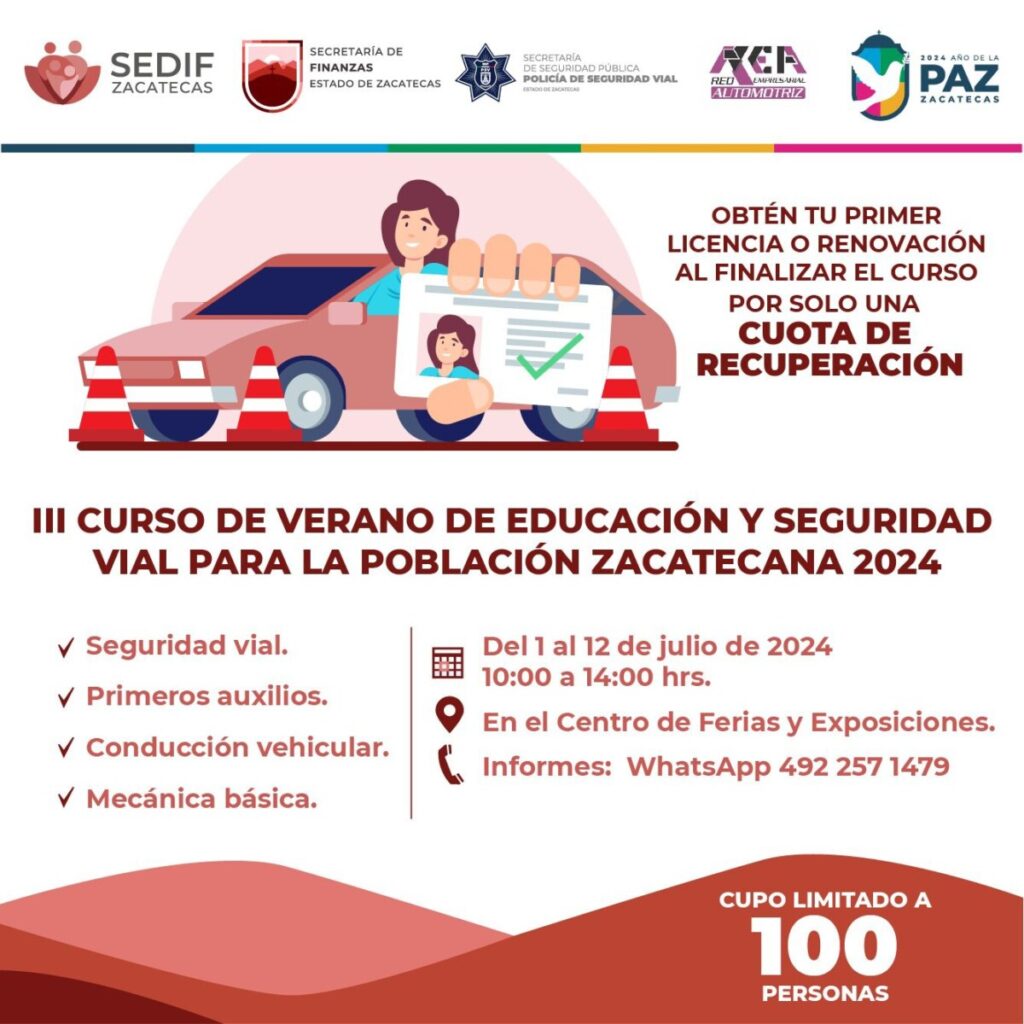 A través de redes sociales oficiales del Sistema Estatal para el Desarrollo Integral de la Familia (SEDIF), se anunció el curso de verano, en el que se otorgarán herramientas teóricas y prácticas en materia de seguridad vial, primeros auxilios, conducción vehicular y mecánica básica, en un trabajo coordinado con la Dirección de Policía de Seguridad Vial del Estado de Zacatecas.