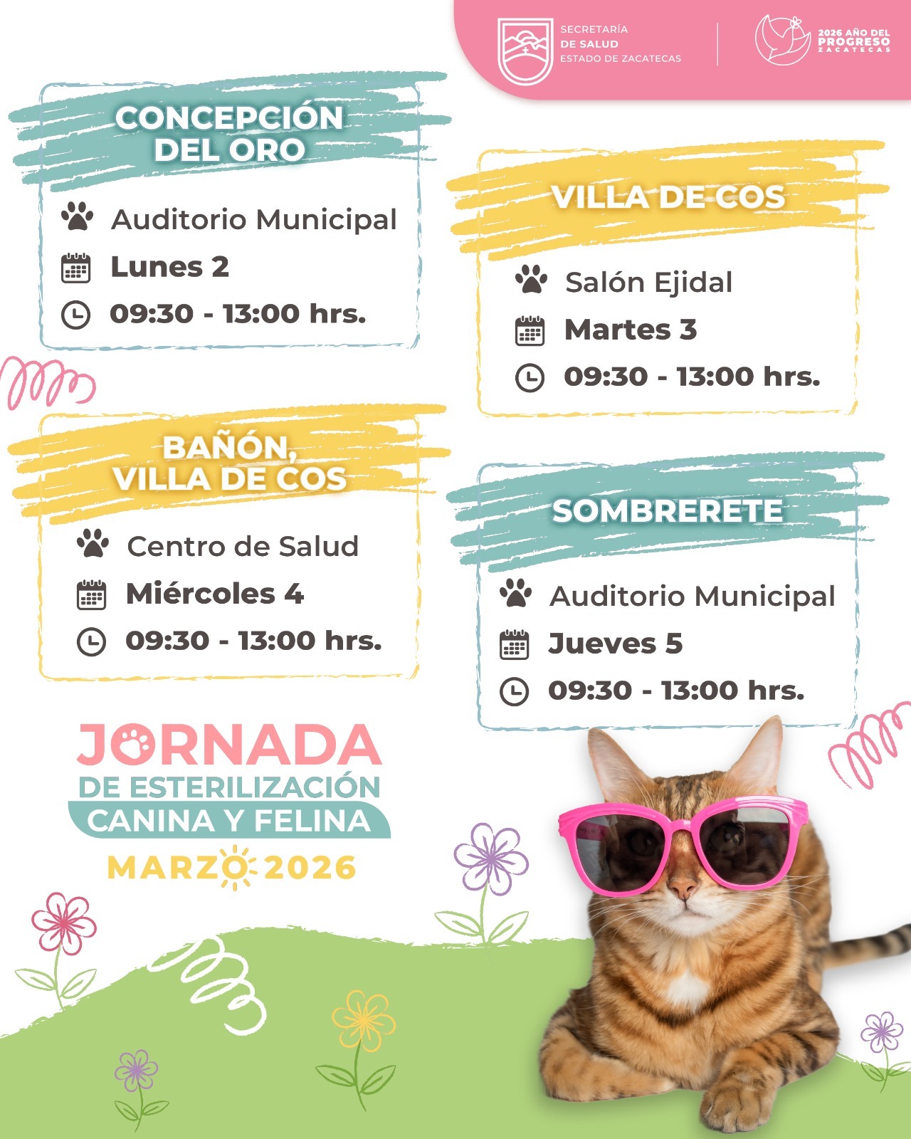 Zacatecas, Zac., 1 de marzo de 2026.- Para acercar servicios de calidad a todas las regiones de la entidad, el Gobierno de Zacatecas, encabezado por el mandatario estatal David Monreal Ávila, a través de la Secretaría de Salud (SSZ), realizará procedimientos para esterilizar a perros y gatos en municipios de la zona norte.