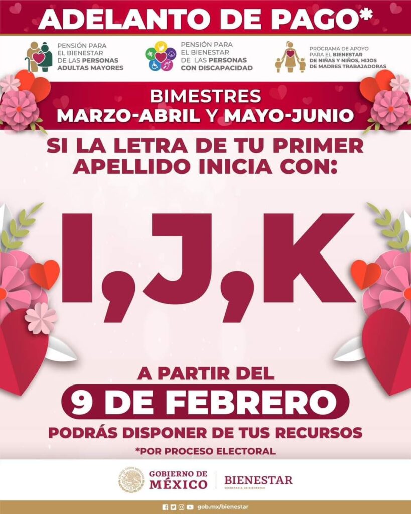 Si tu apellido comienza con la letra I, J, K; a partir del 9 de febrero, podrás disponer de tus recursos del pago adelantado (por el proceso electoral) de los bimestres: MARZO-ABRIL, MAYO-JUNIO de las #PensionesBienestar y el programa #MadresTrabajadoras.Consulta el calendario de pago aquí: https://www.gob.mx/bienestar#PrimeroLosPobres
