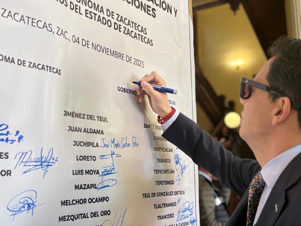 Zacatecas, Zac., 4 de noviembre de 2025.- Luego de atestiguar la firma del convenio de colaboración y concertación de acciones entre la Universidad Autónoma de Zacatecas (UAZ) y los municipios de la entidad, el Secretario General de Gobierno, Rodrigo Reyes Mugüerza, en representación del Jefe del Ejecutivo, David Monreal Ávila, se pronunció por fomentar e impulsar la democratización del conocimiento, con la finalidad de generar mayor desarrollo en Zacatecas.