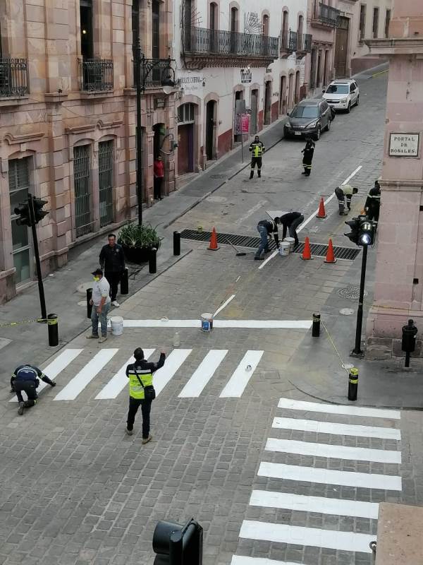 Zacatecas, Zac.-En acciones encaminadas a impulsar una adecuada cultura vial en la capital zacatecana y para dar mayor seguridad a la población, brigadas de infraestructura vial de la Dirección de Policía de Seguridad (DPSV) refuerzan y mejoran la señalética vial en el centro histórico.