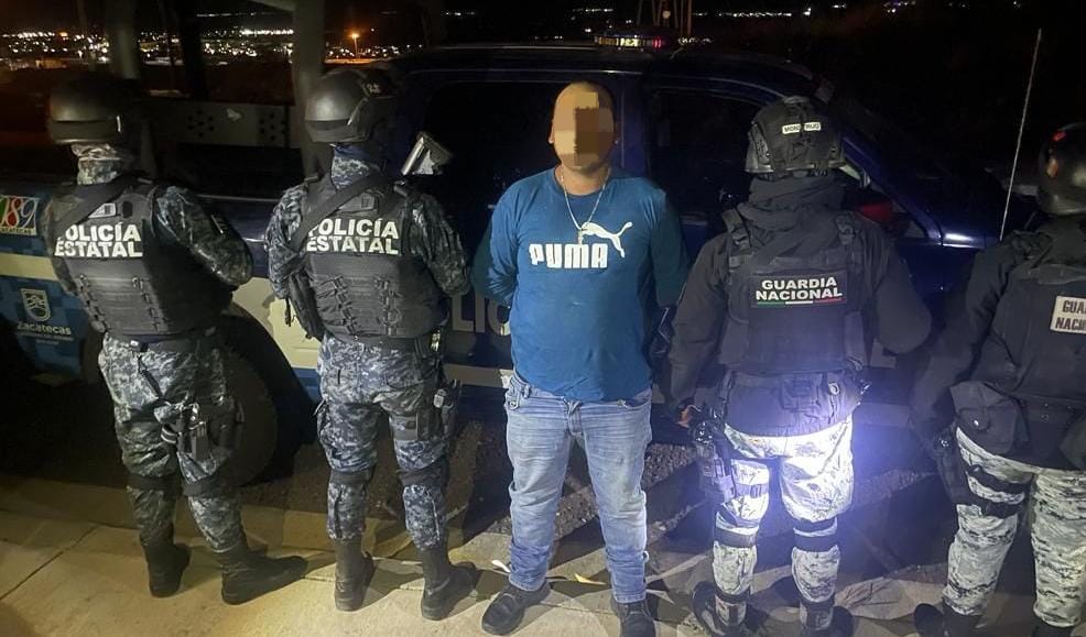 En una acción coordinada entre las Fuerzas de Reacción Inmediata Zacatecas (FRIZ) de la Policía Estatal Preventiva, Ejército Mexicano y Guardia Nacional, en la cabecera municipal de Guadalupe, se logró la aprehensión de Juan Manuel N., de 25 años de edad, quien se trasladaba en una camioneta Toyota negra, con placas de circulación de la Ciudad de México.