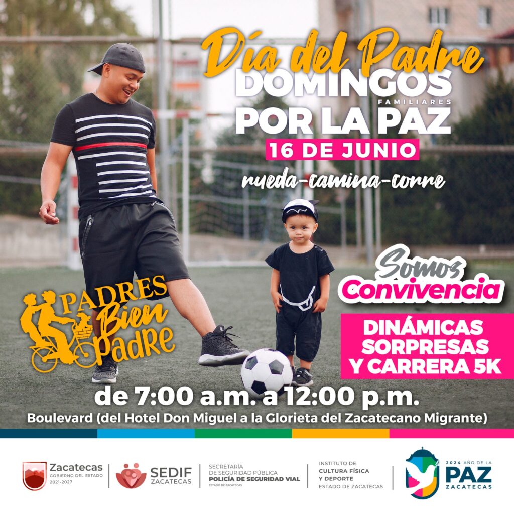 Zacatecas, Zac., 6 de junio de 2024.- En el marco de la celebración del Día del Padre, el próximo domingo 16 de junio, el Gobierno de Zacatecas prepara diferentes actividades para ofrecer a las familias zacatecanas espacios de convivencia sana y segura, tales como una carrera de cinco kilómetros, cascaritas de fútbol y básquetbol, activaciones físicas, entre otras dinámicas y sorpresas.