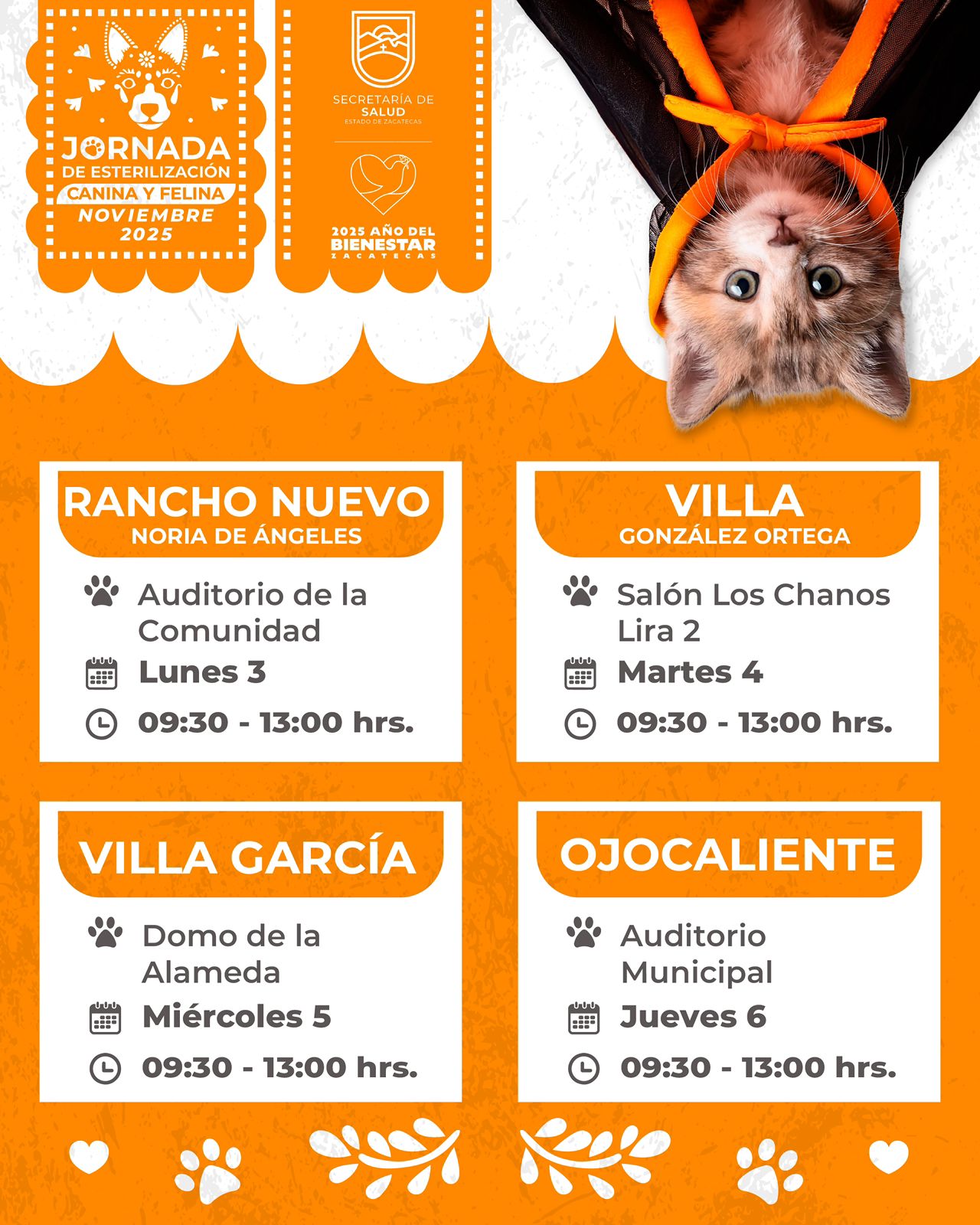 Zacatecas, Zac., 2 de noviembre de 2025.- Con el objetivo de mantener controladas las poblaciones canina y felina en la entidad, durante el inicio de mes, personal de la Secretaría de Salud de Zacatecas (SSZ) visitará cuatro municipios a fin de ofrecer cirugías gratuitas para la esterilización de perros y gatos y fomentar, con ello, la cultura de ser dueños responsables.
