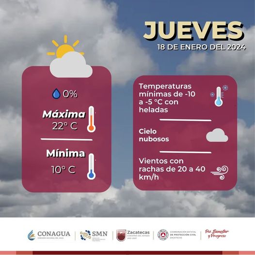 PronΓ³stico del #ClimaEnZacatecas para el jueves 18 de enero de 2024! ![]()