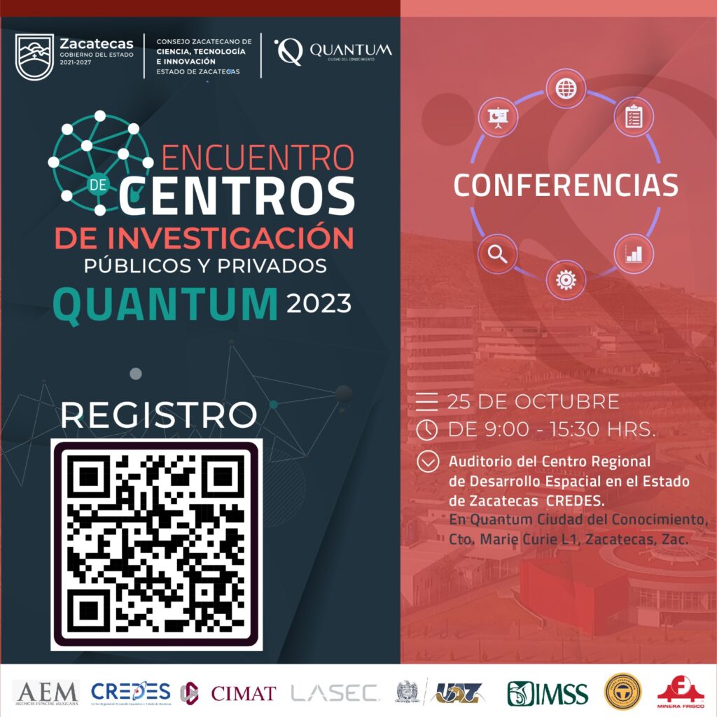 Zacatecas, Zac., 23 de octubre de 2023.- El Gobierno del Zacatecas, a través del Consejo Zacatecano de Ciencia, Tecnología e Innovación (Cozcyt), en colaboración con Quantum Ciudad del Conocimiento, llevará a cabo el Primer Encuentro de Centros de Investigación Públicos y Privados en Zacatecas, a realizarse el miércoles 25 de octubre, en las instalaciones del Auditorio del Centro Regional de Desarrollo Espacial en el Estado de Zacatecas (CREDES).