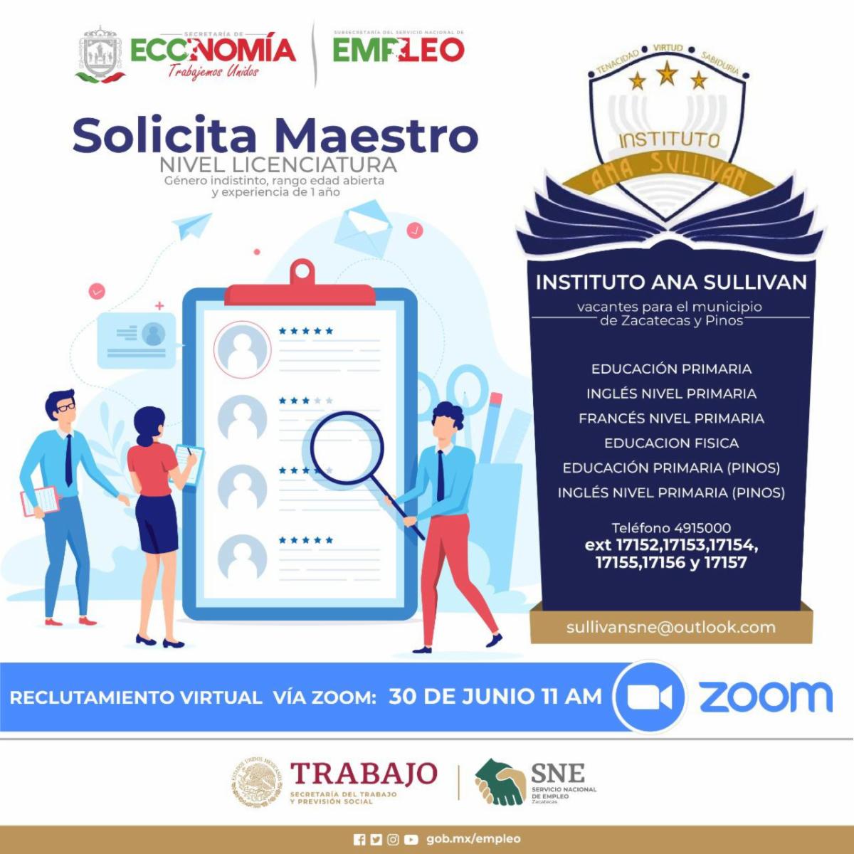 El próximo martes 30 de junio, el Servicio Nacional del Empleo Zacatecas realizará la Jornada de Reclutamiento Virtual número 12, informó Cliserio del Real Hernández, titular de la dependencia. En esta ocasión es para el Instituto Ana Sullivan, que tiene vacantes en los municipios de Zacatecas y Pinos.