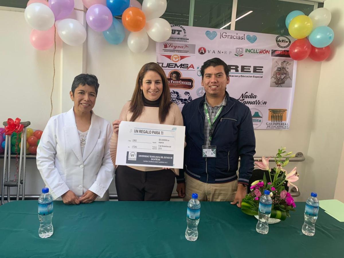 Zacatecas, Zac.- Estudiantes del cuarto semestre de la carrera de Desarrollo de Negocios, área Mercadotecnia de la Universidad Tecnológica de Zacatecas (UTZAC), entregaron al Centro de Rehabilitación y Educación Especial (CREE) un donativo de 24 mil pesos en especie consistente en material didáctico para apoyar las acciones que se realizan en el área de terapia de lenguaje.