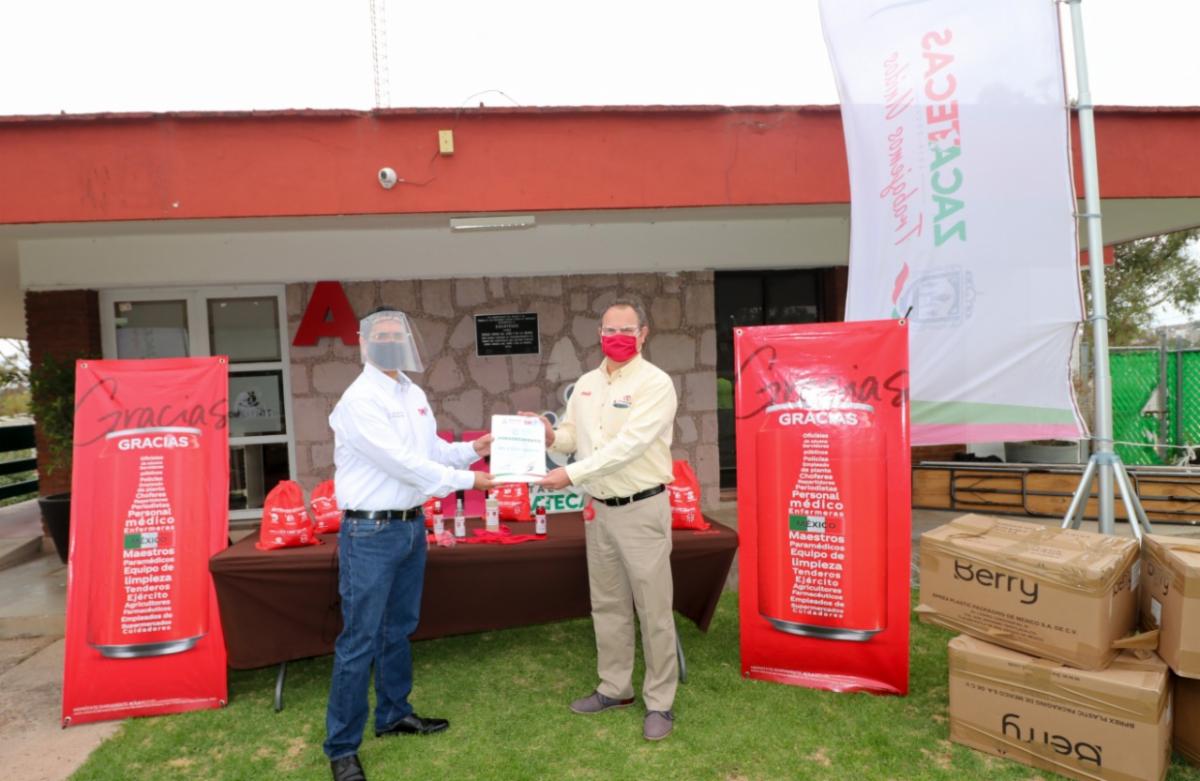 A nombre del Gobernador Alejandro Tello Cristerna y de la Presidenta Honorífica del SEDIF, Cristina Rodríguez de Tello, el Director General de la institución, Omar Acuña Ávila, con las medidas de sana distancia, recibió los paquetes entregados por Martín Cavazos Pérez, gerente general de Arca Continental en Zacatecas.