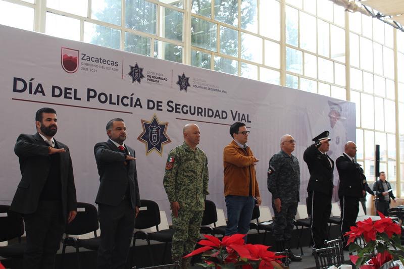 Zacatecas, Zac., 22 de diciembre 2023.- En la celebración del 80 aniversario del Día del Policía de Seguridad Vial, el Secretario General de Gobierno, Rodrigo Reyes Mugüerza, entregó equipo y vehículos para fortalecer las operaciones de esta corporación, a cuyos integrantes les recordó que con su labor diaria contribuyen de manera determinante a crear un entorno de paz para las familias zacatecanas.