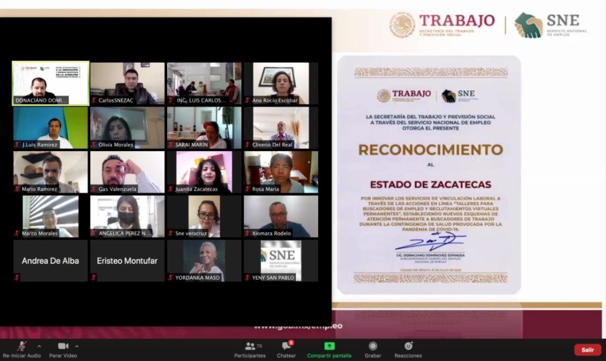 Zacatecas, Zac.- Como resultado del impulso del Gobernador Alejandro Tello y el trabajo del personal de la Subsecretaría del Servicio Nacional del Empleo (SSNE) de la Secretaría de Economía, Zacatecas obtuvo el reconocimiento por innovar en los servicios de vinculación laboral, a través de las diferentes plataformas digitales.