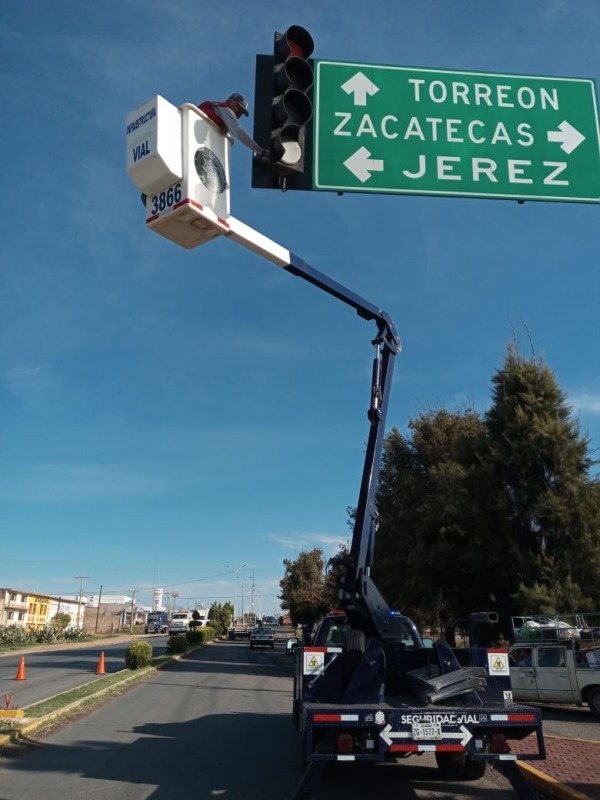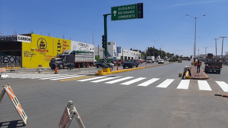 Fresnillo, Zac.- Brigadas de la Dirección de Policía de Seguridad Vial (DPSV) del gobierno estatal, reforzaron la señalética en el bulevar Jesús Varela Rico en la cabecera municipal de Fresnillo; en cuatro cruceros semaforizados colocaron pintura de piso, división de carriles, pasos peatonales, pintura de estructura de semáforo e instalaron señales verticales.