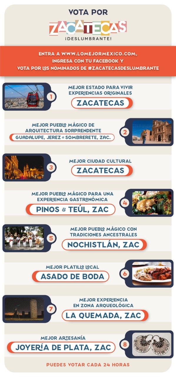 Eduardo Yarto, secretario de turismo invitó a la población en general para que voten por Zacatecas en las distintas postulaciones, a través del portal www.lomejormexico.com/, a donde se puede ingresar mediante una cuenta de Facebook desde el pasado domingo primero de marzo y hasta el día 15 de este mes.