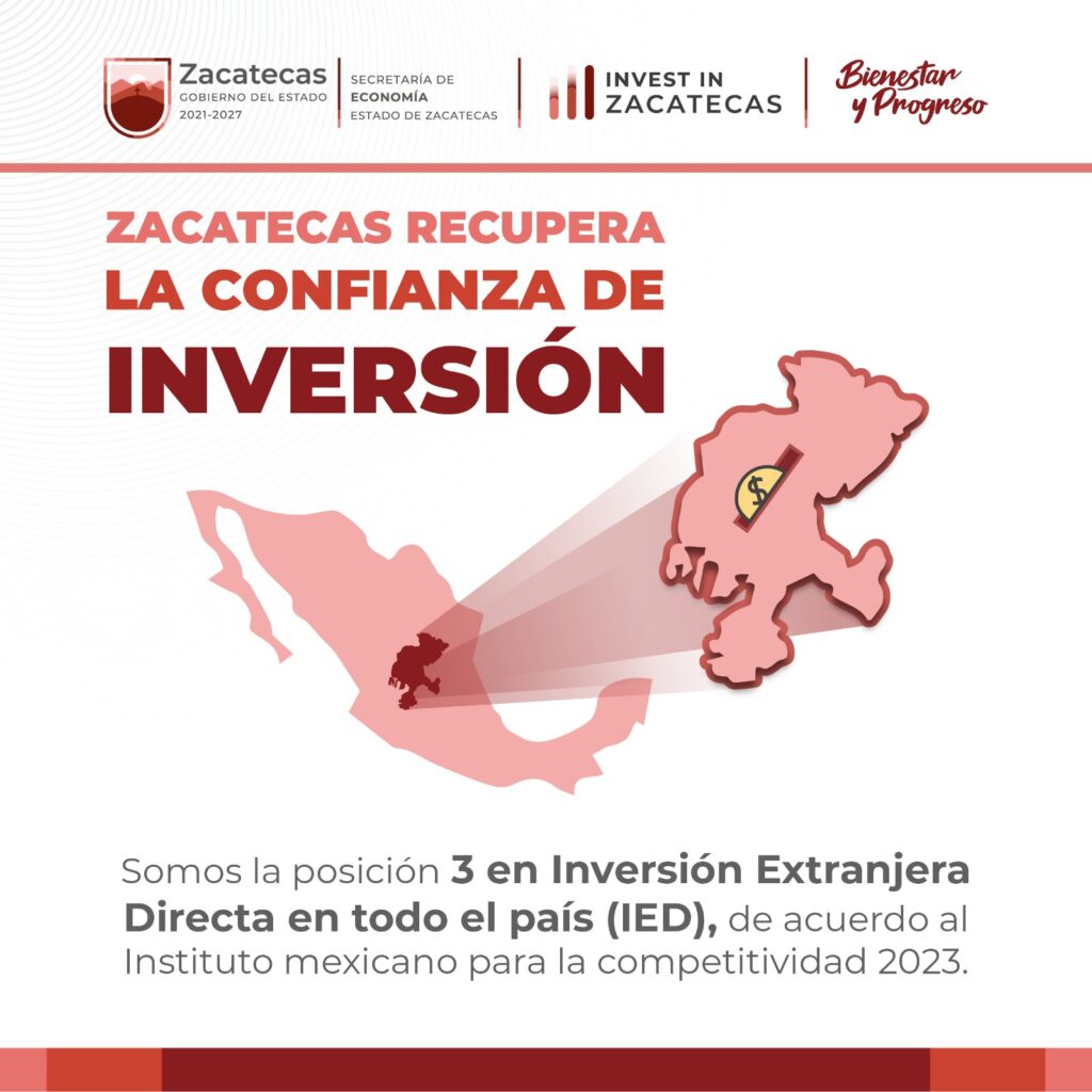 Zacatecas, Zac., 21 de junio de 2023.- Zacatecas se posiciona como líder nacional en Inversión Extranjera Directa, al escalar del vigésimo al tercer puesto, según datos del Instituto Mexicano para la Competitividad.