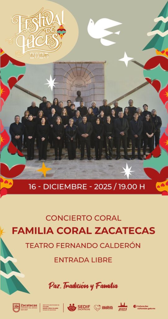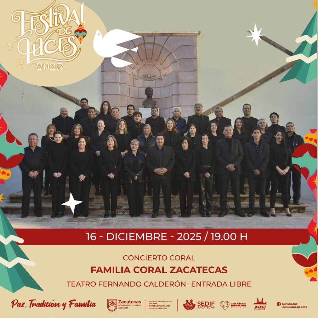 Zacatecas, Zac., 11 de diciembre de 2025.- Como parte del Festival de Luces 2025, que lleva a cabo el Gobierno del Estado, encabezado por el mandatario estatal David Monreal Ávila, la agrupación Familia Coral Zacatecas invita a su tradicional concierto navideño, donde más de 40 voces en escena ofrecerán un recorrido sonoro lleno de tradición, emotividad y celebración.
