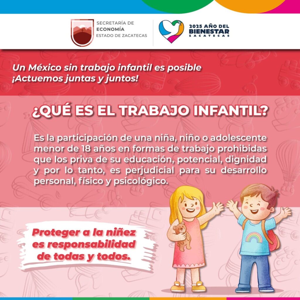 Zacatecas, Zac., 12 de junio de 2025.- El Gobierno de Zacatecas, que encabeza el mandatario estatal David Monreal Ávila, a través de la Secretaría de Economía y su Dirección del Trabajo y Previsión Social, se une a la conmemoración del Día Mundial contra el Trabajo Infantil, con el firme compromiso de erradicar esta problemática y garantizar una infancia plena, libre de explotación y con acceso a sus derechos fundamentales.