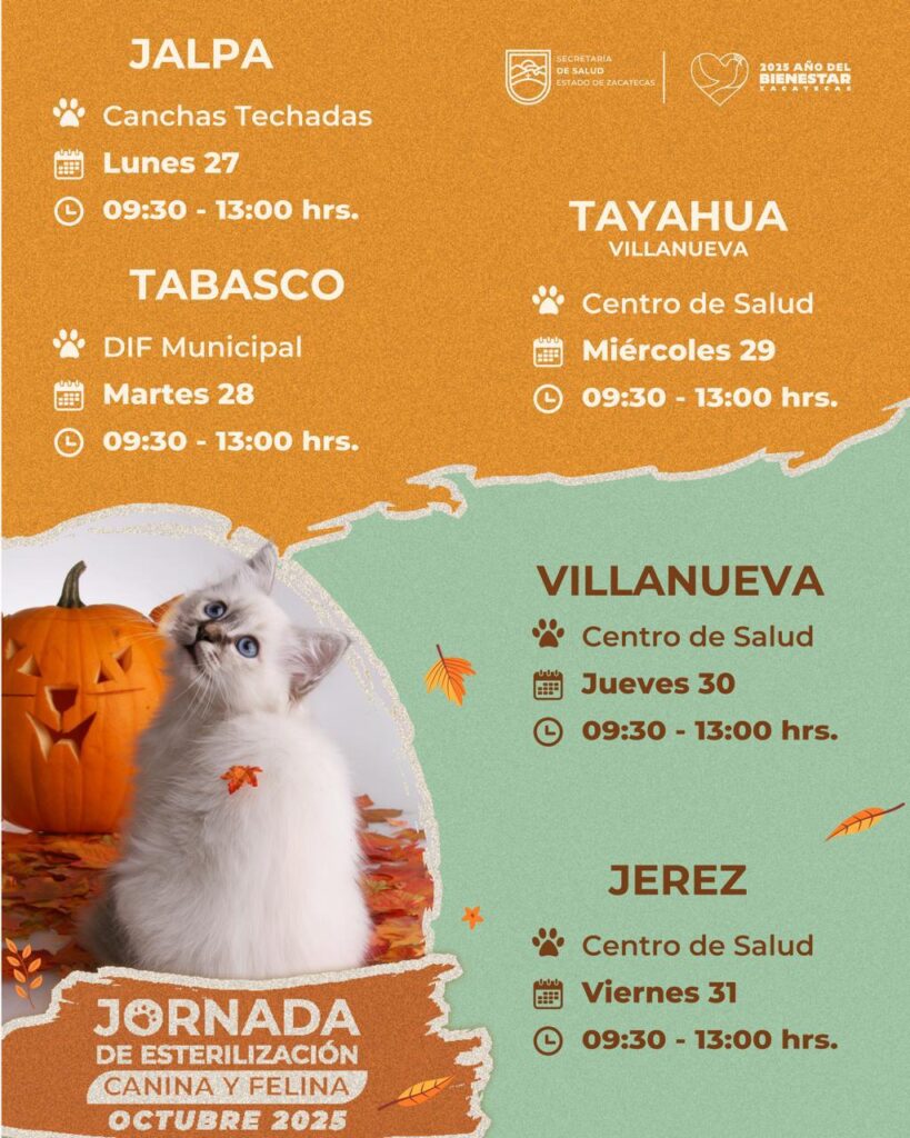 El lunes 27 de octubre se instalará un módulo en las canchas techadas de Jalpa; el martes 28 en las instalaciones del DIF Municipal de Tabasco; mientras que el miércoles 29 la brigada llegará al Centro de Salud de Tayahua y el jueves 30 al Centro de Salud de Villanueva; las actividades semanales concluirán el viernes 31 en el Centro de Salud de Jerez.