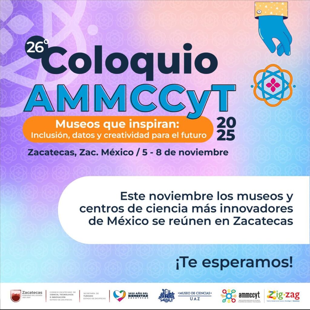 Zacatecas, Zac., 2 de noviembre de 2025.- Con la participación de conferencistas, talleristas y ponentes de Colombia, Estados Unidos, Aguascalientes, Durango, Zacatecas, del Instituto Politécnico Nacional (IPN) y la Universidad Autónoma de Zacatecas (UAZ), entre otros, se realizará el 26 Coloquio de la Asociación Mexicana de Museos y Centros de Ciencia y Tecnología (AMMCCyT) 2025.