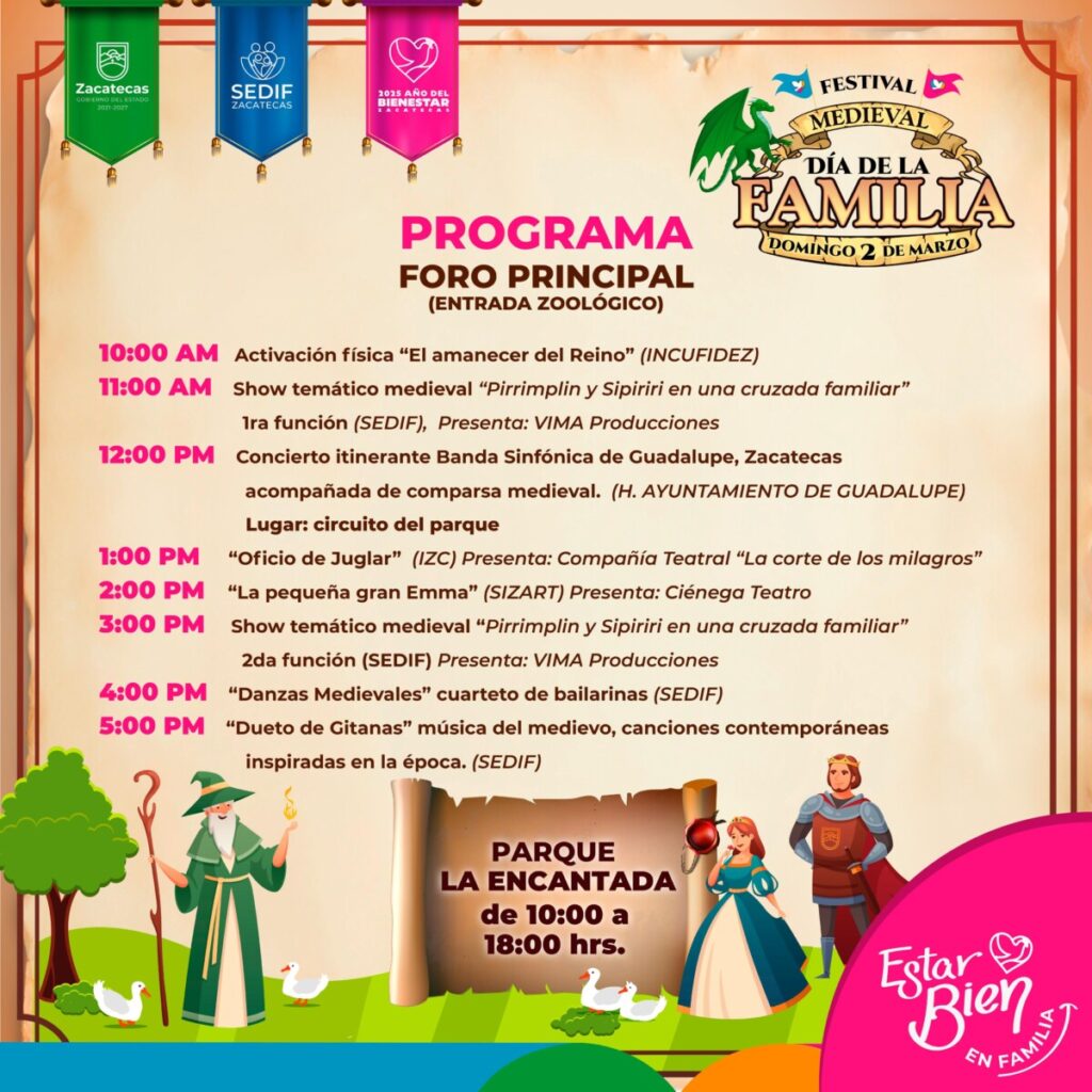 Zacatecas, Zac., 27 de febrero 2025.- Con el objetivo de fomentar la convivencia y el entretenimiento para todas las edades, el Gobierno de Zacatecas, que encabeza el mandatario David Monreal Ávila, a través del Sistema Estatal para el Desarrollo Integral de la Familia (SEDIF), presidido por la señora Sara Hernández de Monreal, invita a la ciudadanía a disfrutar del Festival Medieval Día de la Familia, evento que ofrecerá una amplia variedad de actividades para el disfrute de niñas, niños y adultos.
