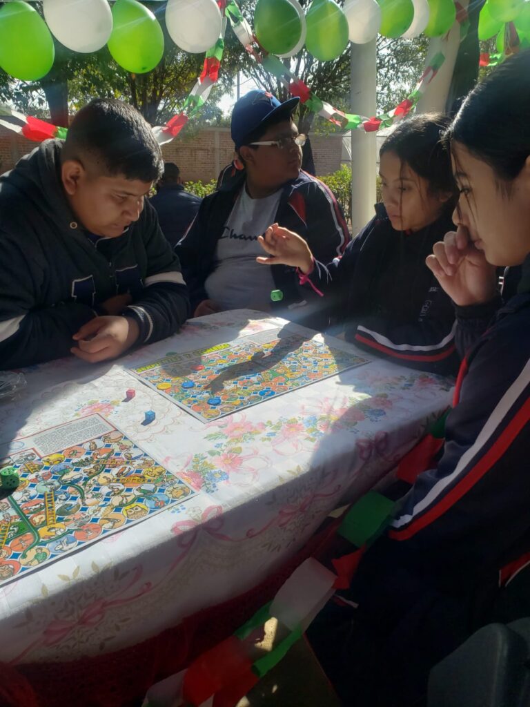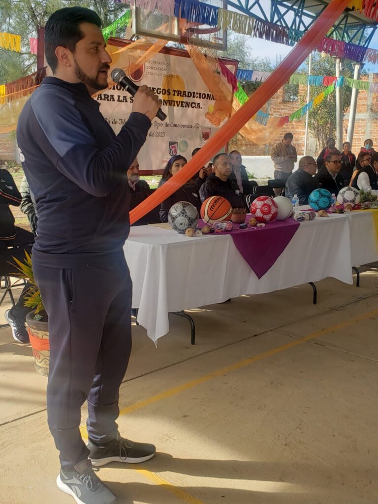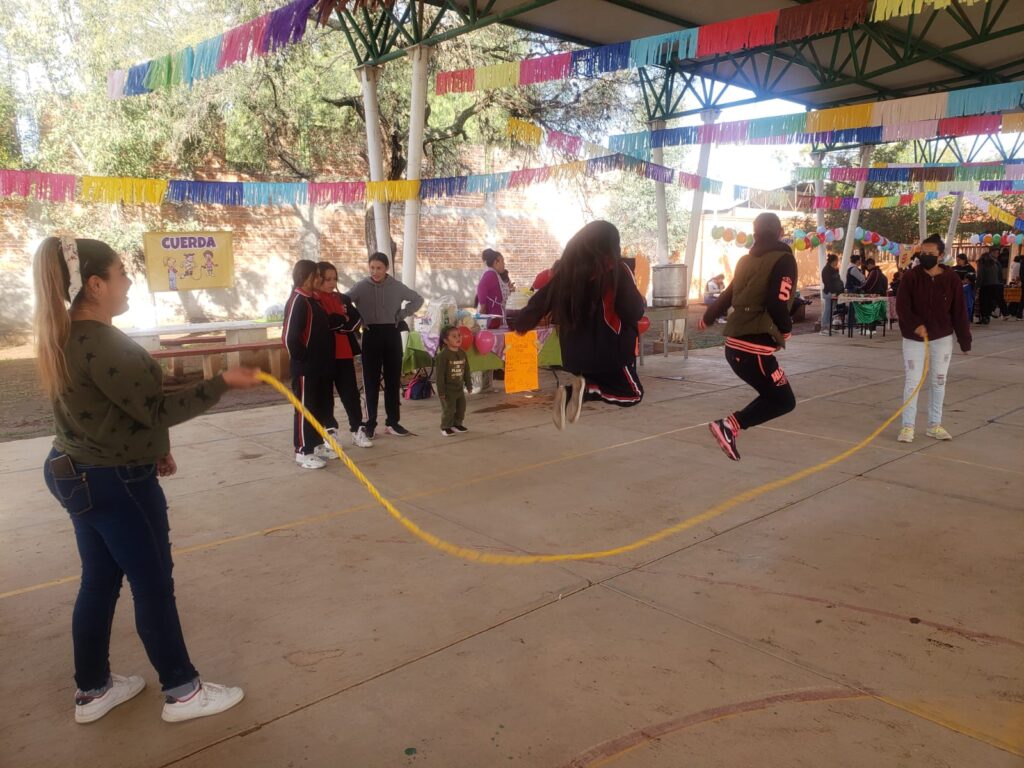 Luis Moya, Zac., 29 de noviembre de 2023.- A través del juego lotería, serpientes y escaleras, valeros, trompos, tiro al blanco y al saltar la cuerda, docentes, madres de familia y estudiantes de la Telesecundaria Cuitláhuac, ubicada en el municipio de Luis Moya, participaron en el arranque del programa Recuperación de Juegos Tradicionales para la Sana Convivencia, enfocado a mantener la paz en los centros escolares, rescatar valores y regenerar el tejido social.