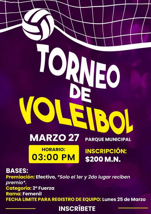 Participa en el próximo torneo de voleibol a celebrarse el 27 de Marzo a las 3:00 p.m. en el Parque Municipal. Inscripción: $200 M.N.