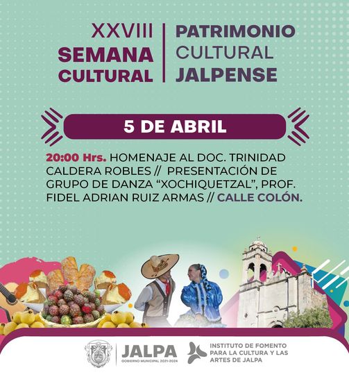 XXVIII Semana Cultural «Patrimonio Cultural Jalpense» 5 abril, 20245 abril, 2024efrain Los esperamos el día de hoy 5 de abril, para que disfruten del programa de la XXVIII Semana Cultural «Patrimonio Cultural Jalpense». TAMBIÉN TE PUEDE INTERESAR BUSCAN TRAER A MINEROS A JALPA
