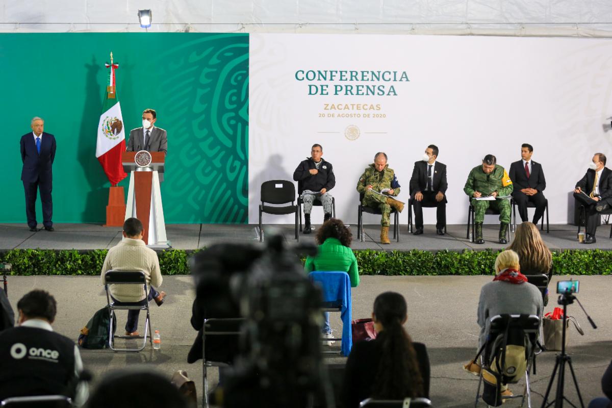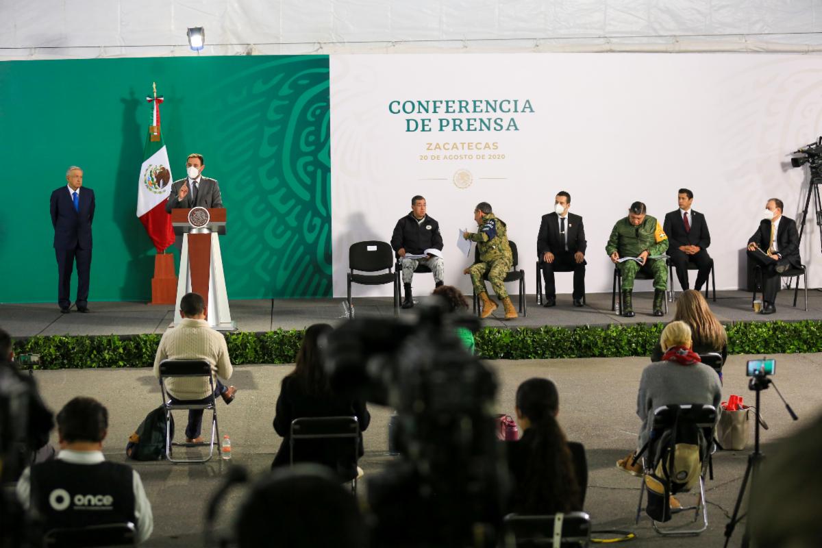 En conferencia matutina ofrecida desde las instalaciones de la Decimoprimera Zona Militar, ubicadas en Guadalupe, Zacatecas, el Gobernador agradeció al Presidente Andrés Manuel López Obrador su preocupación y compromiso con la entidad, así como la valía y el trabajo que realizan el Ejército Mexicano y la Guardia Nacional en este territorio, por el bien de las y los zacatecanos.